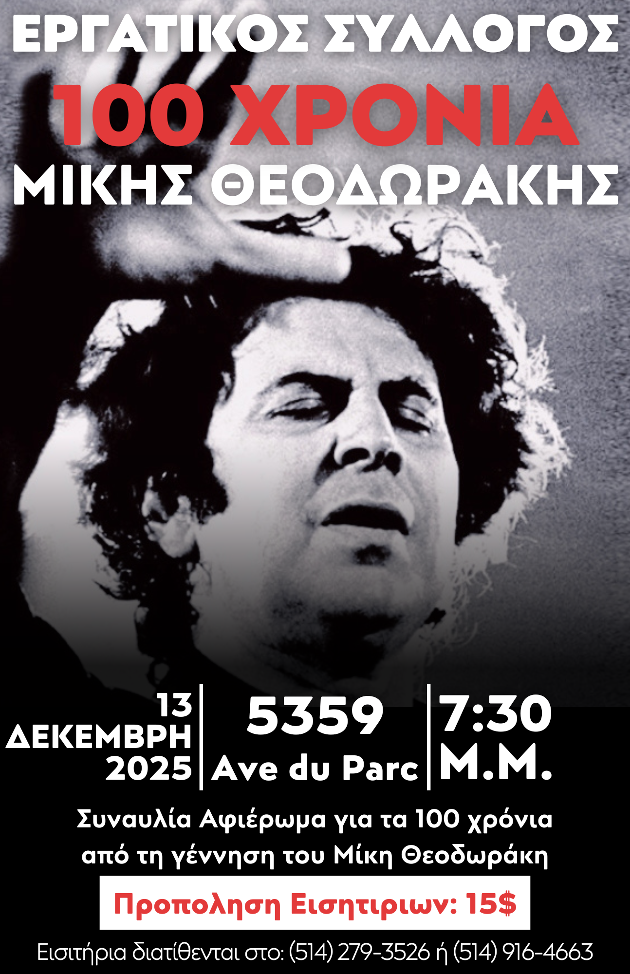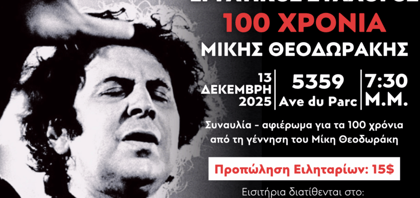 Ο Εργατικός Σύλλογος Ελλήνων του Κεμπέκ, που φέτος συμπληρώνονται 100 χρόνια από τη γέννησή του Μίκη Θεοδωράκη, διοργανώνει μεγάλη συναυλία τιμής στο έργο του μεγάλου συνθέτη, το Σάββατο 13 Δεκέμβρη 2025, στις 7:30 μ.μ., στην αίθουσα του Συλλόγου (5359 Ave du Parc).